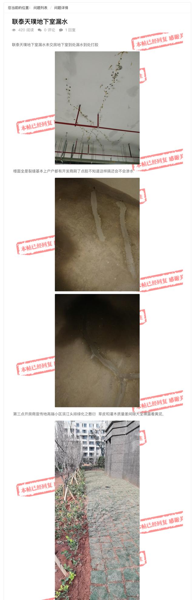 尊敬的网友:您好!您在“网络问政”平台上反映的“联泰天璞地下室漏水”问题已收悉,我区立即指派监督人员至现场调查核实及查阅相关资料,现将有关情况回复如下:1、针对“未交房地下室到处漏水到处打胶”问题。该项目正处于收尾阶段,关于地下室存在漏水问题,我区工作人员督促各责任单位对地下室进行全面排查并将质量问题登记造册,并于1月5日上午组织建设、施工、监理、设计单位召开质量问题技术处理会,形成了技术处理专项方案,并督促施工单位严格按方案要求落实整改措施,目前正在整改当中。2、针对“楼面全是裂缝基本上户户都有开发商刷了点胶不知道这样搞会不会渗水”问题。关于楼面板裂缝问题,我区工作人员责令建设、施工、监理单位对该项目的每套住房实体质量进行全面排查,建立质量问题台账,明确整改措施、整改时限,并要求施工单位逐项逐条整改销号,逐户逐套分户验收,并形成验收记录。目前上述反应问题正在整改当中。3、针对“开房商宣传的高端小区滨江头排绿化之敷衍,草皮和灌木质量差间隙大全裸露着黄泥”问题。联泰天璞项目仍处于施工阶段,我局将要求施工方严格按照设计方案施工,并加强竣工验收环节的管控,确保能高质量完成项目。